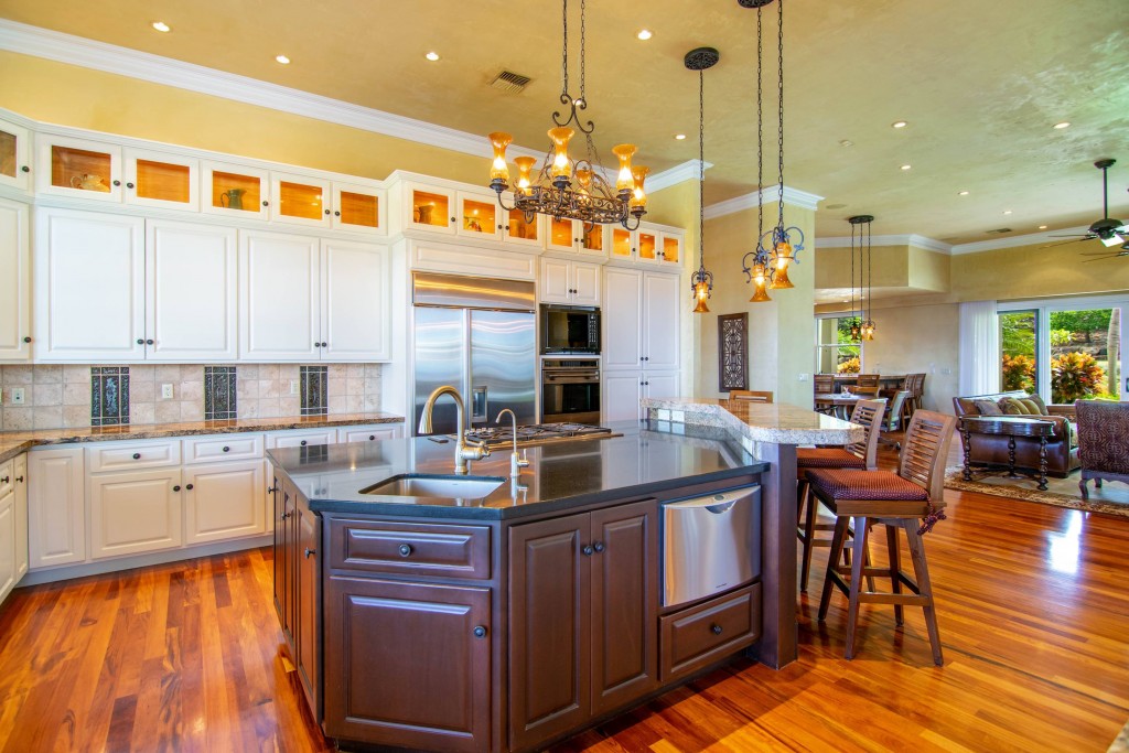 Gracing the slopes of the West Maui Mountains, this estate serves as one of the top properties in Hawaii. Built with the classic plantation days in mind, 65 Wili Okai Way offers the best of style and modern amenities. Situated in the highly sought-after gated neighborhood of Pu’unoa—and placed perfectly on a fully manicured, fruit-bearing 5 acres of land—this 5 bedroom 5.5 bathroom estate with a separate 2 bedroom, 2 bathroom guest home exudes the quintessential Hawaiian family retreat experience. The level of detail is unparalleled, including incredible custom finishes like metal work from famed artist Larry Padilla throughout the property, including all of the fire torches and several architectural elements.