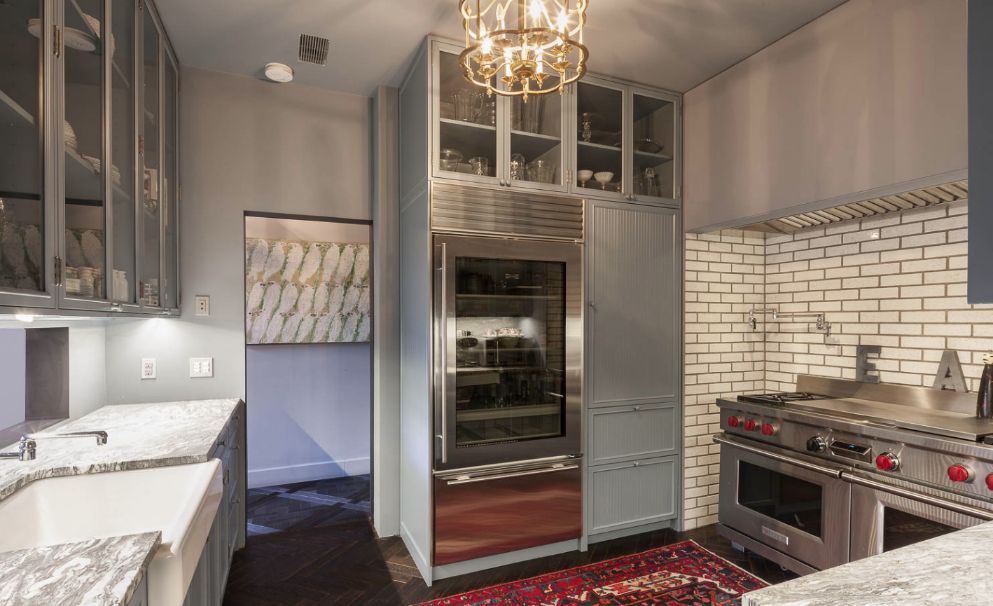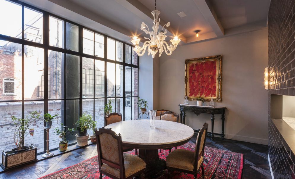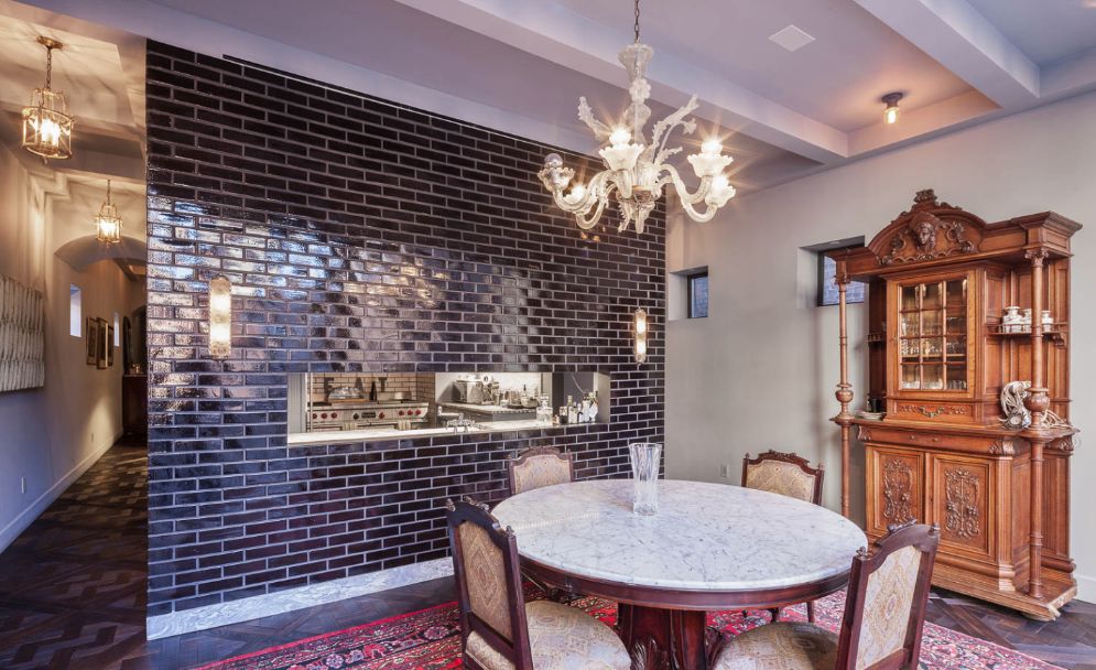 Built as a carriage house in 1912, the charming, 5,400-square-foot brick home, features dramatic double-height ceilings, glass windows, antique brick walls, Russian Ipe wood floors, and three fireplaces (one wood-burning and two gas), the listing states.