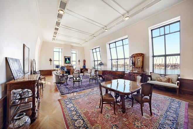 The co-op listing still boasts a whopping 17 rooms: seven bedrooms (including a magnificent master suite complete with its own terrace, full bath, dressing room, and walk-in closets); six-and-a-half baths; a chef’s eat-in kitchen; and an oversized mansard living room soaked in natural light, featuring 17-foot ceilings, beautiful curved windows, and a south-facing terrace overlooking the Hudson.