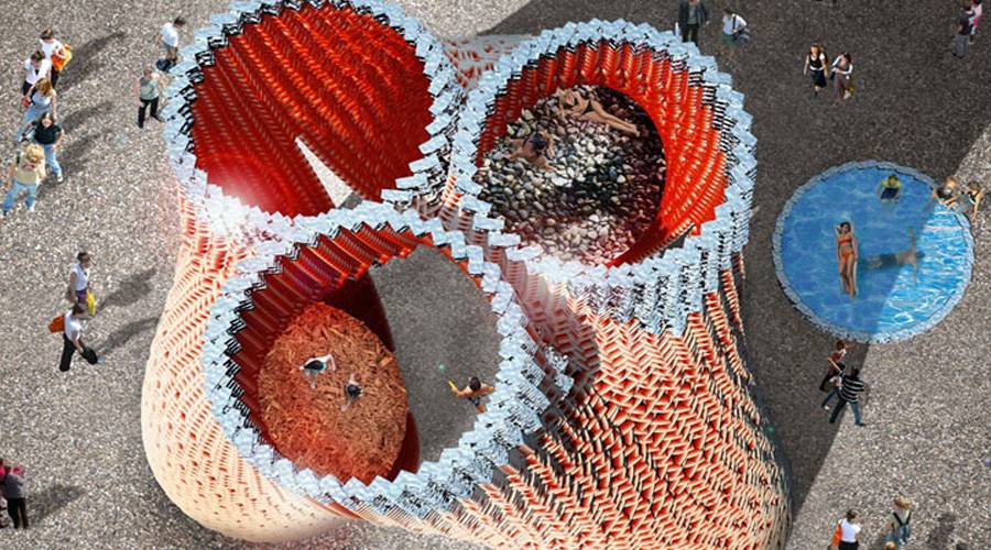 Dezeen reports that the firm will cultivate bio-bricks from agricultural food waste and use them as construction material, making the project entirely sustainable. The Living will collaborate with building firm Ecovative on the project, entitled Hy-Fi.