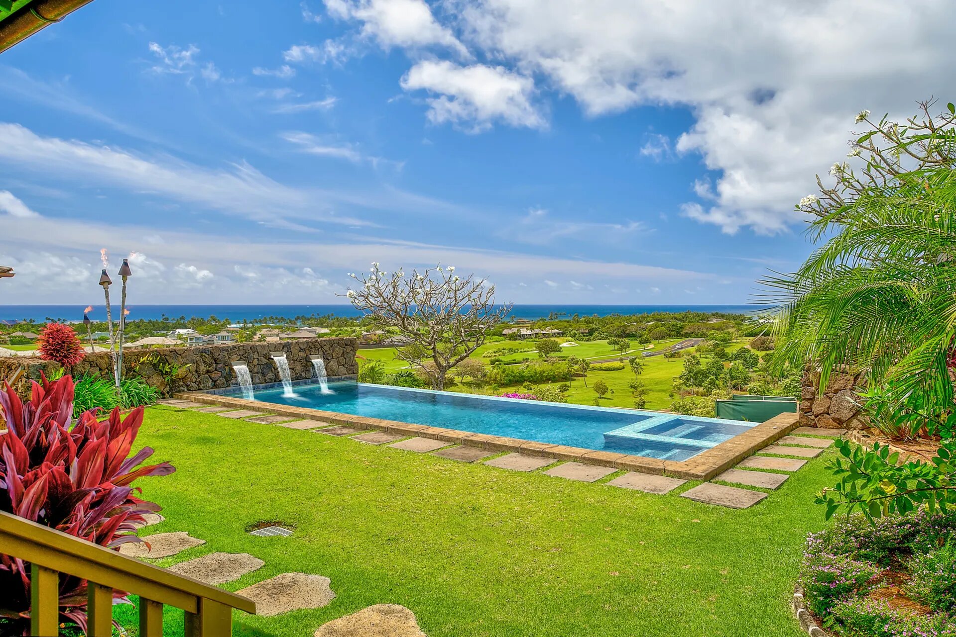 An ultimate resort living experience located in the Kahalawai neighborhood of the Private Resort on Kauai’s South Shore known as Kukuiula. Situated on over 19,000 sq. ft. lot the architect uniquely positioned this single level home for the ultimate privacy from the neighboring lots on either side. The entire backyard is your playground to swim or relax gazing at the sweeping ocean views & magnificent sunsets.