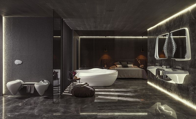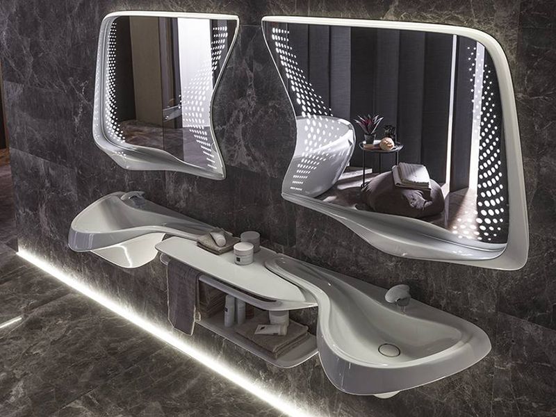 According to Curbed, the combination of pieces in a space create a “dynamic, sensual flow.” For example, the double sink setup features a basin with “attenuated extensions” (acting as built-in soap dishes) which reach toward a small counter that separate the two.